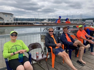 A total of 18 club members ventured down to Poulsbo for the annual Kitsap Invitational Summer Scrimmage (KISS). This year it was an oval-shaped 4000m race on Liberty Bay, with one 180 degree turn. The KISS regatta is held each year to honor Bill Richards, founder of multiple rowing clubs including Kitsap Rowing Association. It was the first KISS race for many club members who went, including three fresh out of Learn-to-Row class. After much discussion, some help from Ron Moller, and a life-size game of “Trailer Tetris” (or jenga), five boats were nested on the trailer, with only a couple having to be de-rigged. We had four boats for Rat Rowers, and one loaner for rowers from Port Angeles.